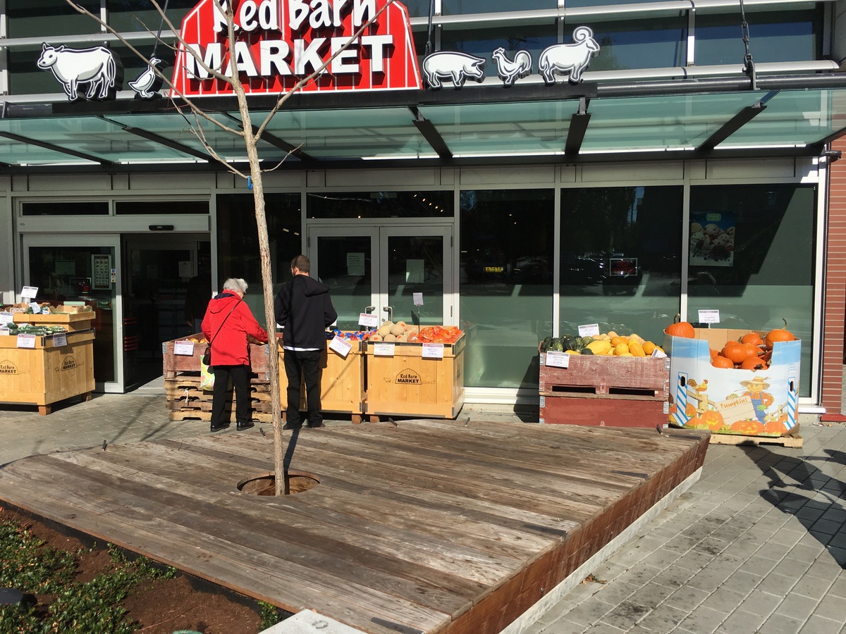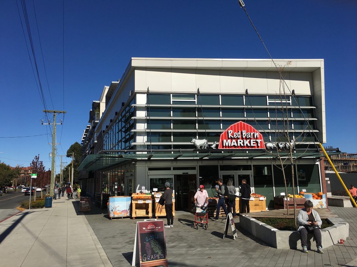 The southernmost end of the building houses a Red Barn Market, which is a locally-owned grocery chain with a focus on carrying products produced by local-area farmers and small-scale food processors. Having a grocery store in the Capital Park development means that residents or workers in the building and neighbourhood can reduce the amount of travel required to buy their daily necessities.