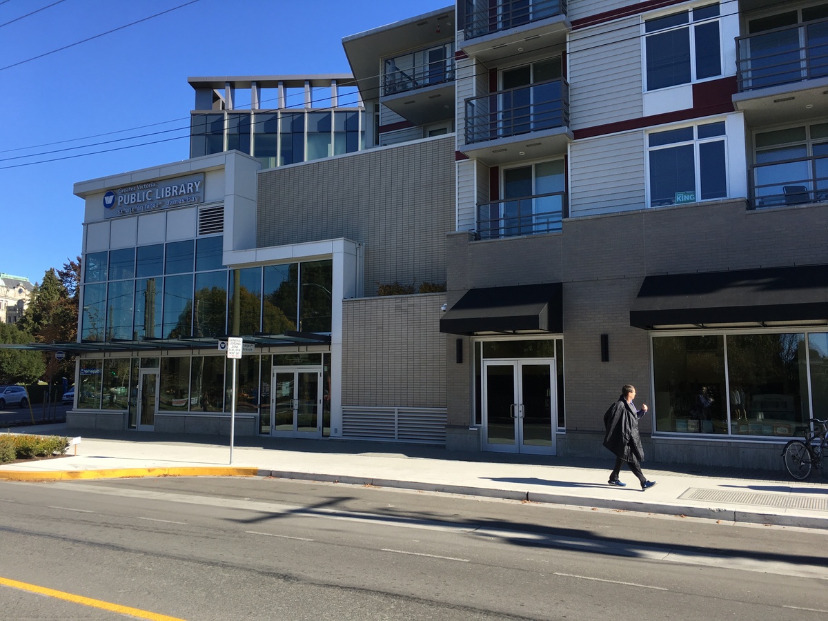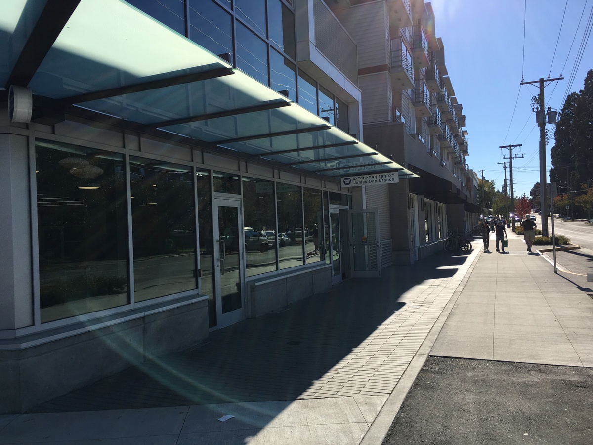 The other end of the building houses the sxʷeŋxʷəŋ təŋəxʷ James Bay branch of the Victoria Public Library. Pronounced s-hweng hw-ung tongue-oo-hw, sxʷeŋxʷəŋ təŋəxʷ is the Lekwungen name for James Bay. A major amenity for the neighbourhood, the branch offers book lending, a kids area, public computers, and bookable community and study rooms.