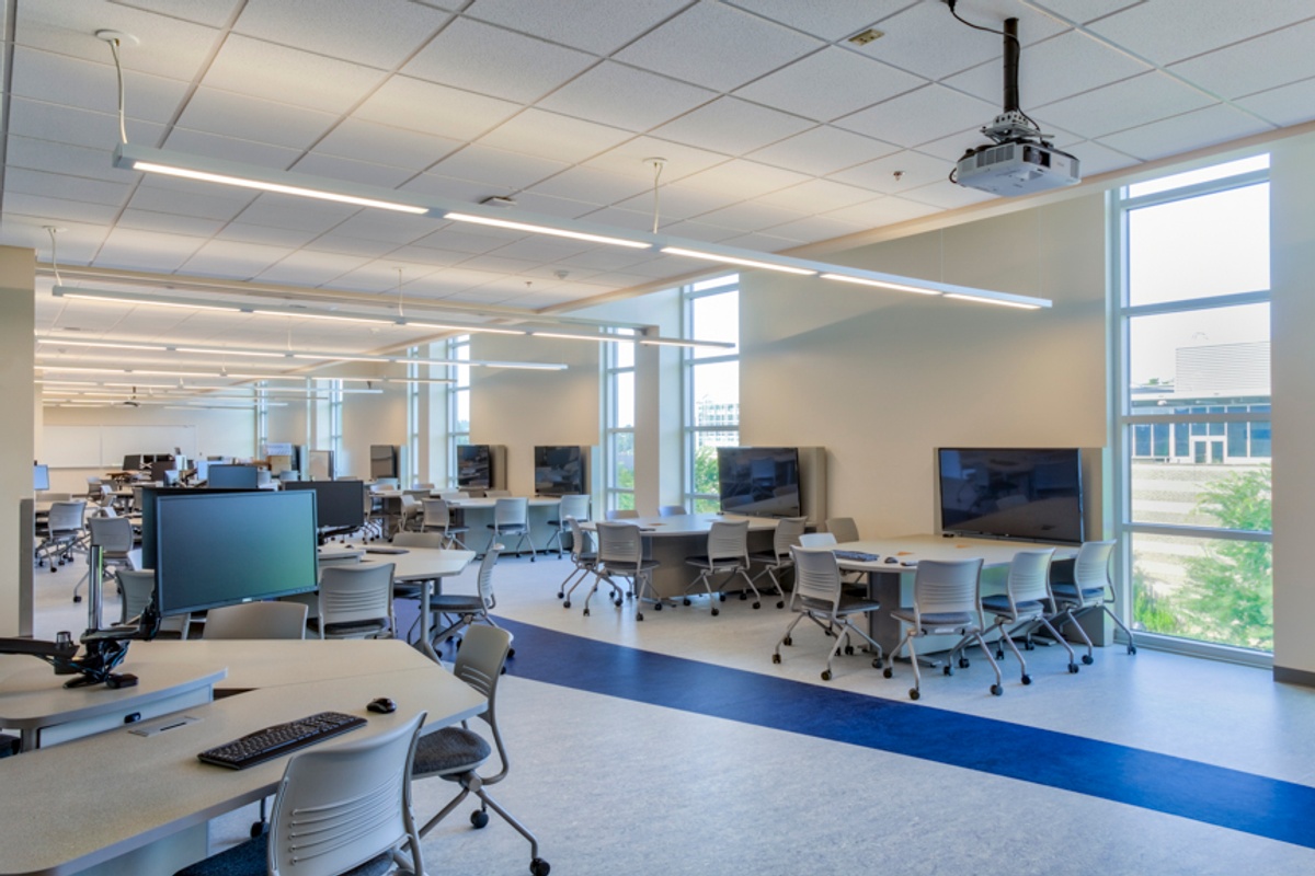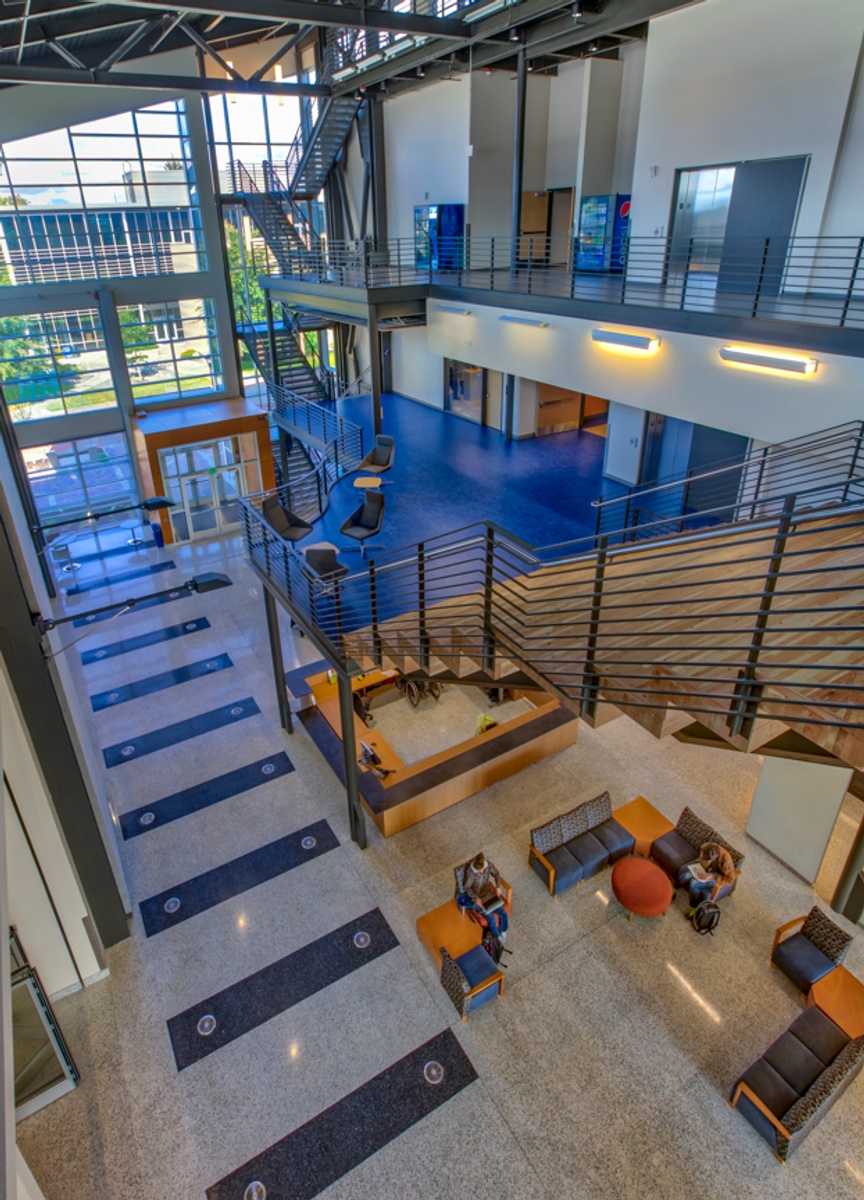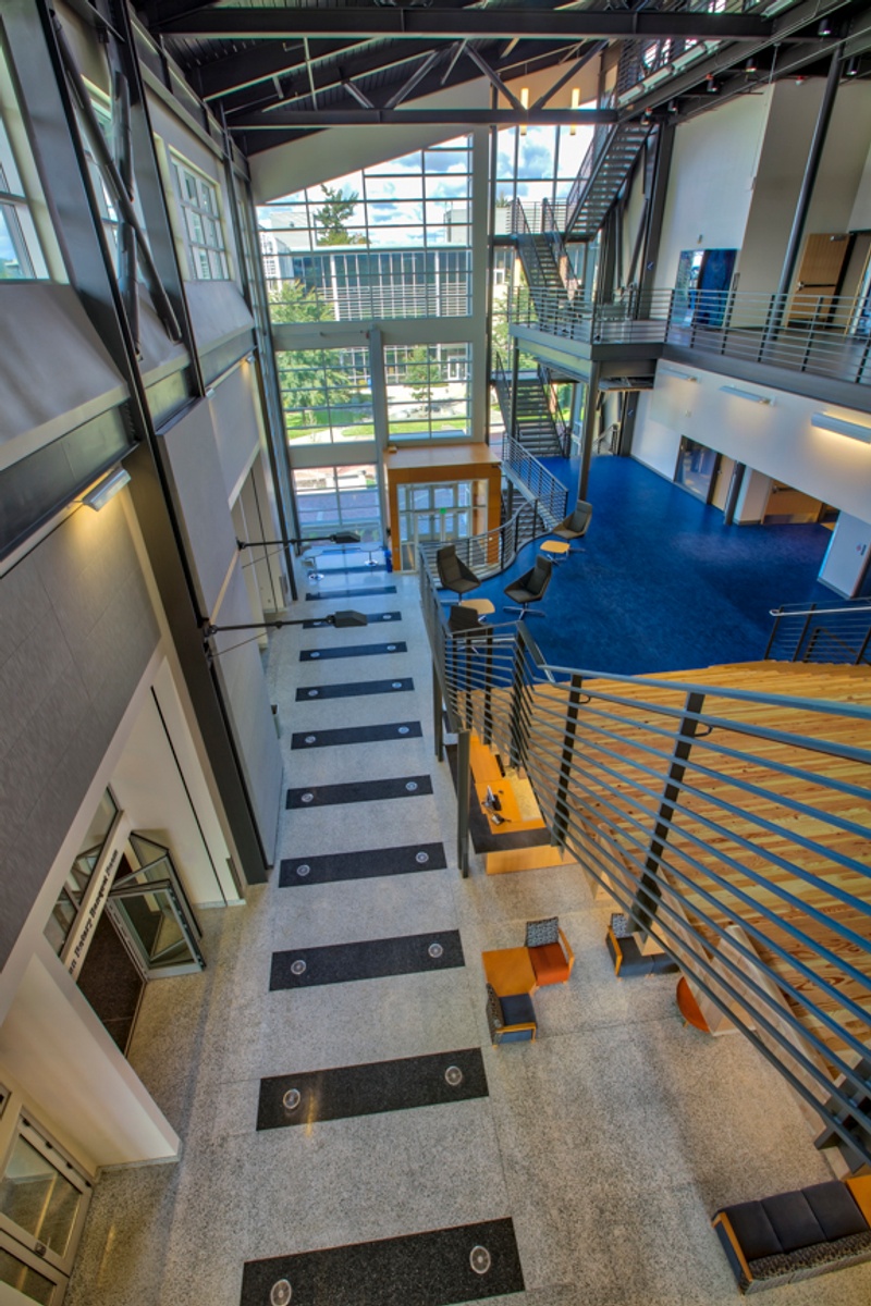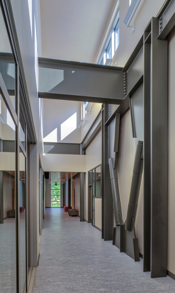 Anyone who walks into the Atrium will immediately be struck by the amount of natural light that fills the space. The architects included a large amount of window space in the building so that as much daylight would come in as possible. Research has demonstrated that when people feel connected to the outside they feel and stay healthier, and this feature of the building provides a good learning environment. The third floor of the building where most of the classrooms are, features clear story windows, which are vertical windows that function as skylights. This brings light into interior spaces including hallways and classrooms.