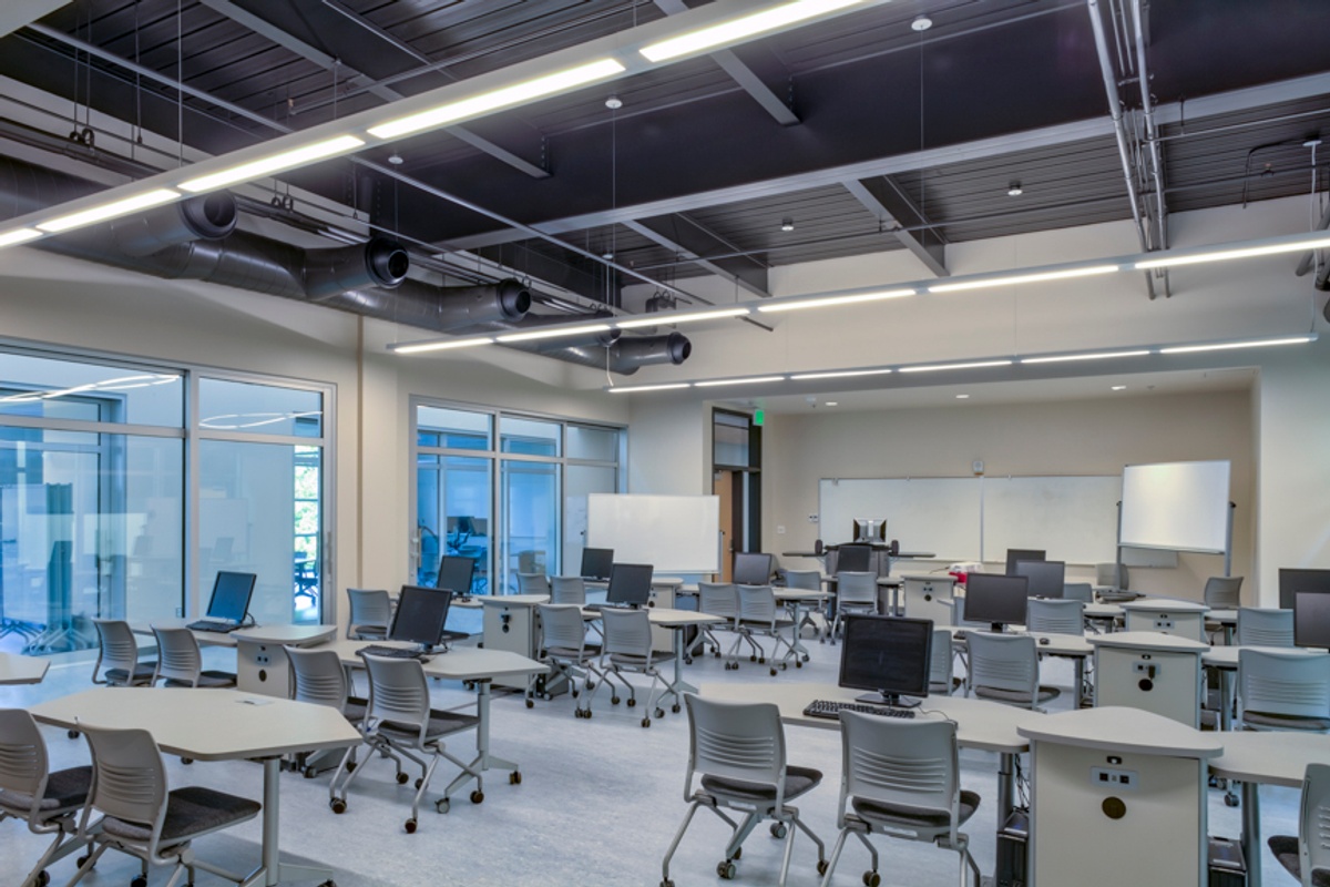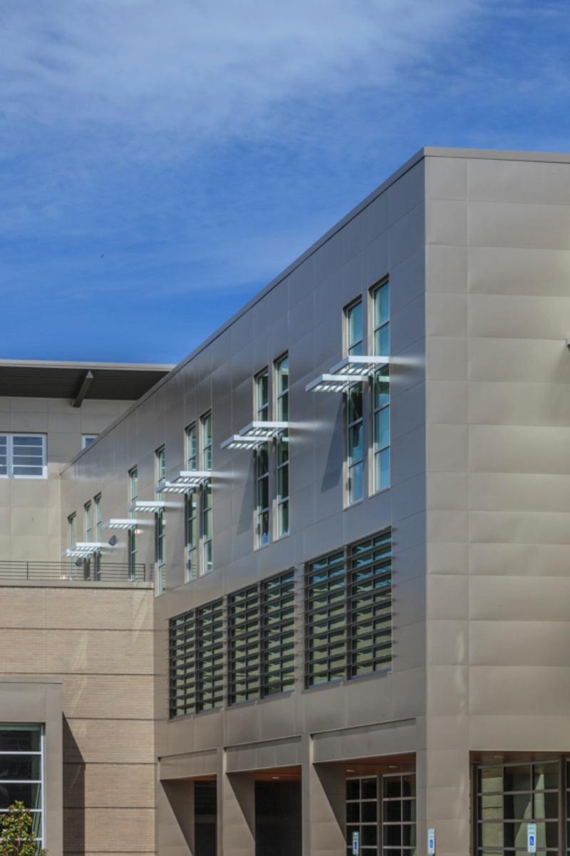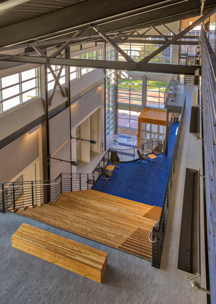 A significant aspect of the building is the attention paid to keeping levels of CO2 within a healthy range. High levels of CO2 can easily occur during high-traffic periods, and can contribute to feelings of sleepiness which is not conducive to a good learning environment. The CO2 levels are managed through a clever passive system. The north end of the building features large vertical-lift doors which open automatically when CO2 levels get too high. Simultaneously, east-facing louver windows at the top of the atrium open. Because hot air will rise from the heated floors, a passive flow of clean air is brought into the building. This fresh air intake system also functions to regulate temperature and works along with the previously mentioned systems through a direct digital control system.