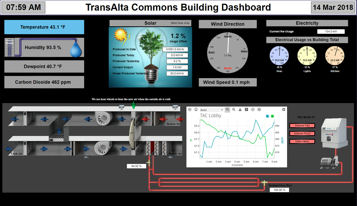 Energy usage and air quality are displayed in real time to anyone walking through the atrium through a building dashboard which is a large display showing energy usage, production from the solar panels, indoor and outdoor temperature and humidity, and the status of the heating and ventilation systems. The level of CO2 can also be viewed in parts per million. This dashboard functions as an educational resource the users of the building, giving them a moment to pause and reflect upon the care that was taken to ensure that the TransAlta Commons is not only providing them with a healthy place to learn, but is also minimizing its impact on the natural environment.