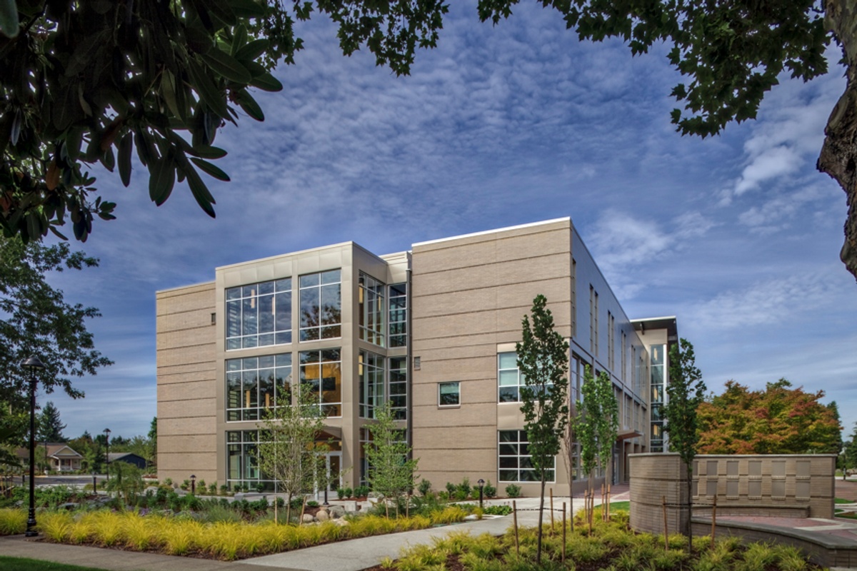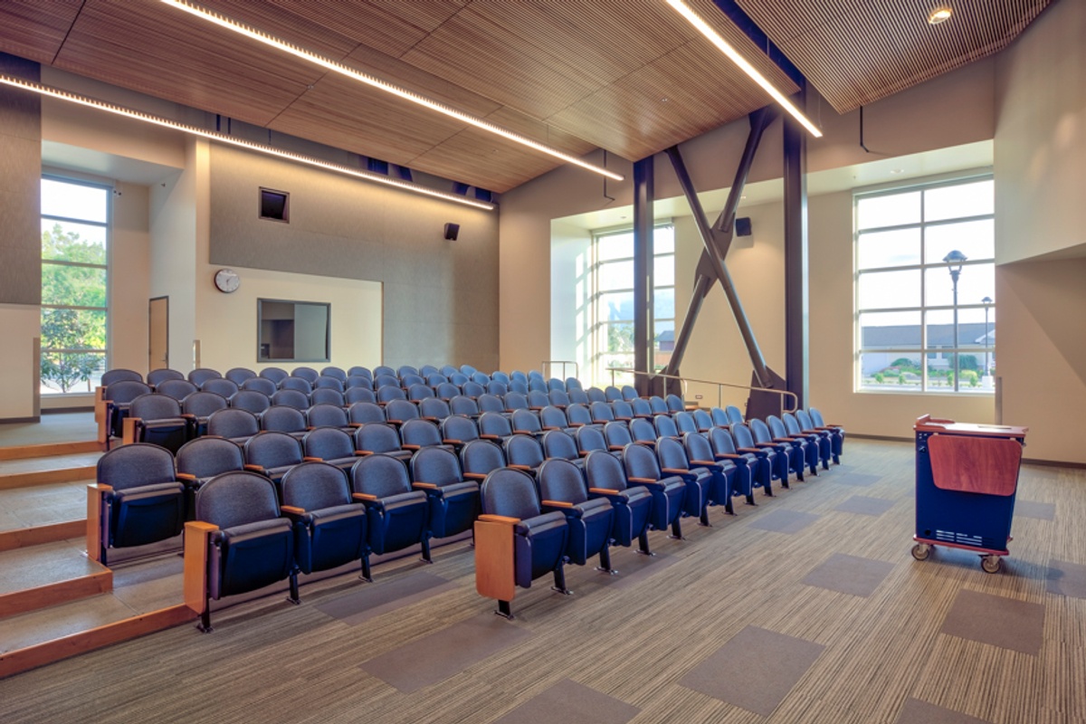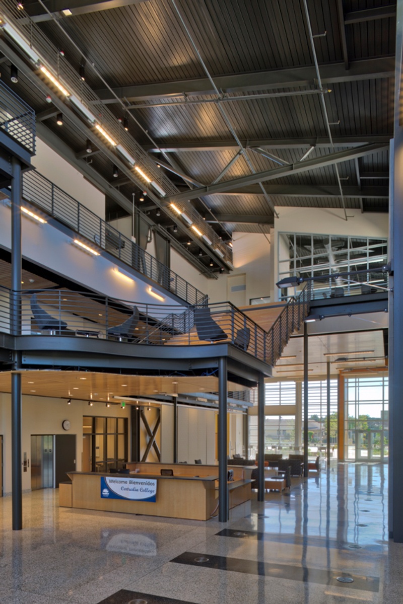 The Centralia College TransAlta Student Commons (known on campus as the TAC) features 69,873 square feet allocated over a three-story facility. The building features a bright and spacious atrium bathed in natural daylight and anchored by a striking suspended wooden staircase known as the learning landscape. In addition to providing updated classroom and office spaces, the building also functions as a hub for services needed by students, including the campus cafeteria which can be used as a 500-seat dining and meeting space, a bookstore, and offices for admissions, registration, and financial aid. The building achieved 3rd party certification via the US Green Building Council, at the Gold level in their Leadership in Energy and Environment Design (LEED) standard.
