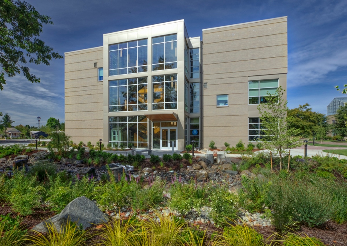 The east side of the building features a rain garden. When it is not raining this attractively landscaped array of native species of plants and river rocks resembles a dry lake bed. When it is raining, the rooftop of the building, which has a slight slope towards the garden collects water which is drained by two large drainpipes into a stream which passes under the sidewalk and into the rain garden. After a heavy rainstorm the rain garden is briefly transformed into a small pond. The water then naturally infiltrates into the ground typically over the course of 8-12 hours. This treats the water that falls on the roof as a valuable natural resource rather than a just a problem to be dealt with. On clear days seating is provided for students to enjoy this natural environment.