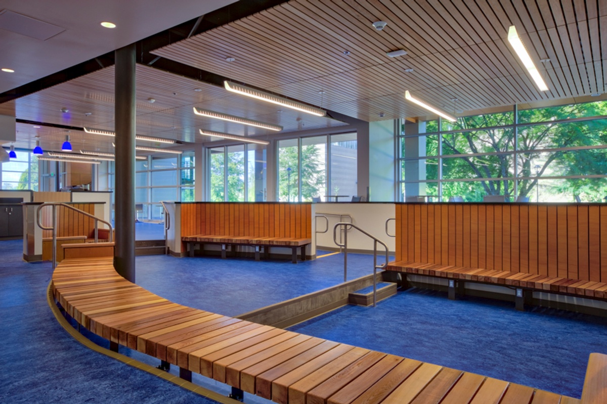 The building makes extensive use of wood including the large glued laminated timber (glulam) beams throughout the building and panels used on the desks and ceiling accents in the administration office. All of the wood used during construction was sourced from certified sustainably harvested sources. This means that the forests will be able to generate wood in perpetuity.