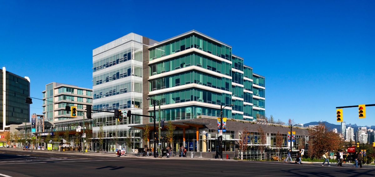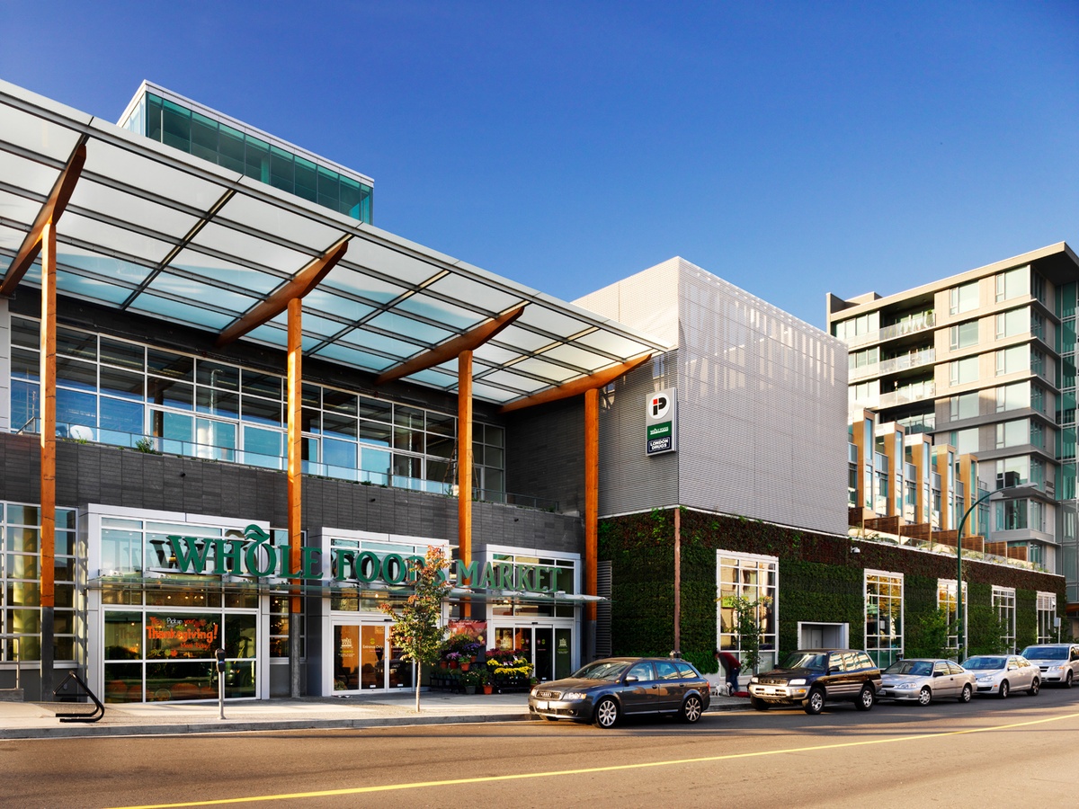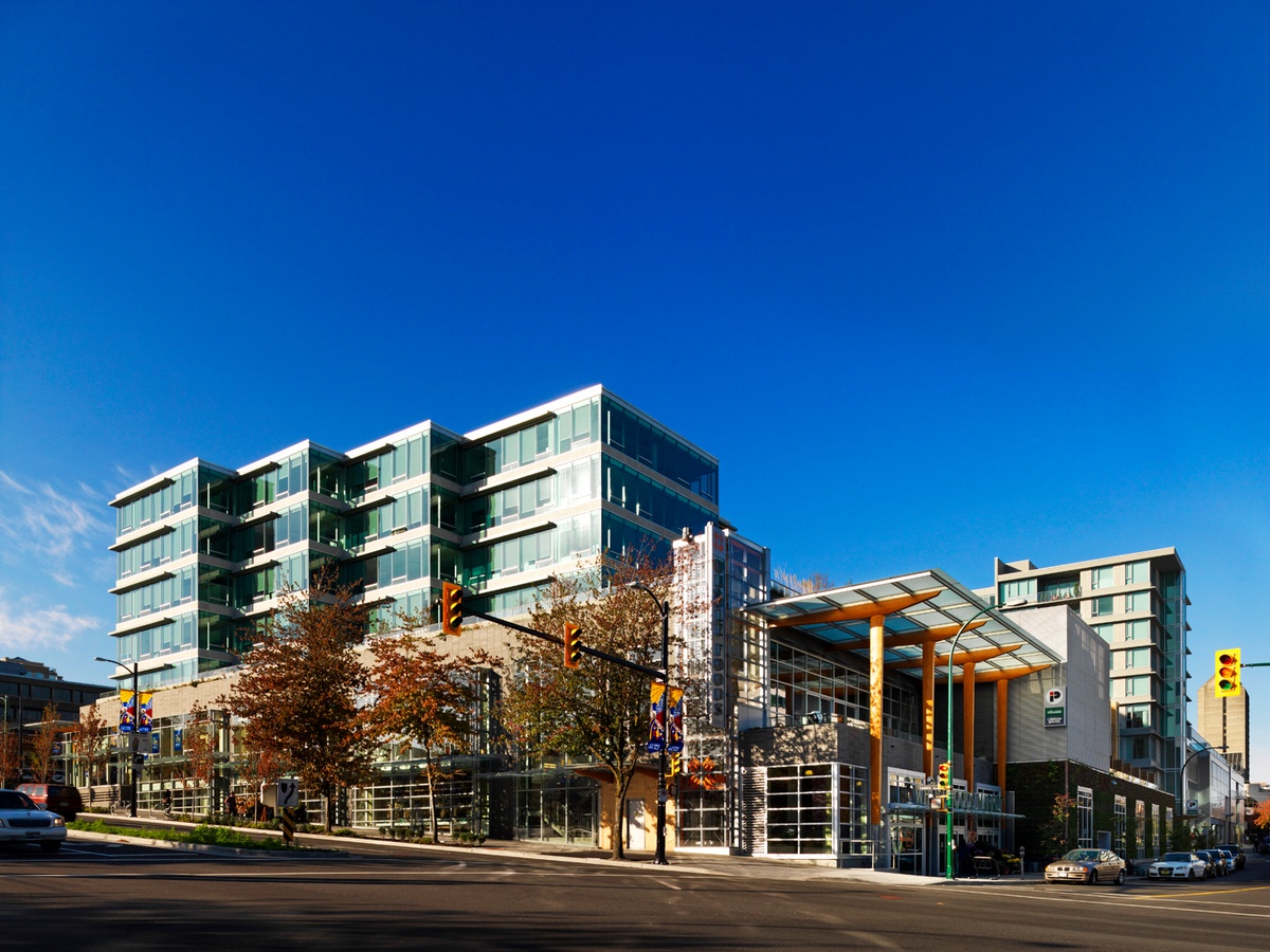 The Crossroads Mixed-use Development is located between 8th Avenue and Broadway along Cambie Street in Vancouver. Due to its size, street frontages, sloping topography and ready transit access, the site is ideally suited to a mix of uses. The project houses large-format food and drug stores, commercial retail units, rental office space, a bank, two restaurants, and market residential uses.