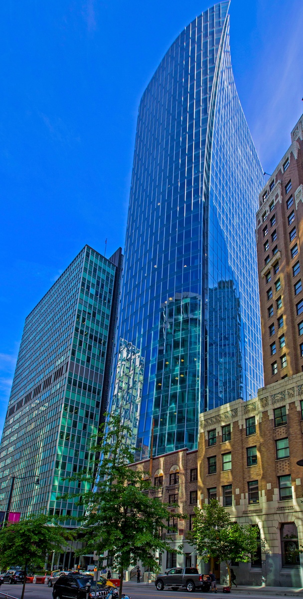 The MNP tower’s exterior demonstrates a unique profile. Shaped like ‘a glass talon’, a slight area increase is visible in the southeast portion of the building with each consecutive floor, creating a variation in square footage from floor to floor.
