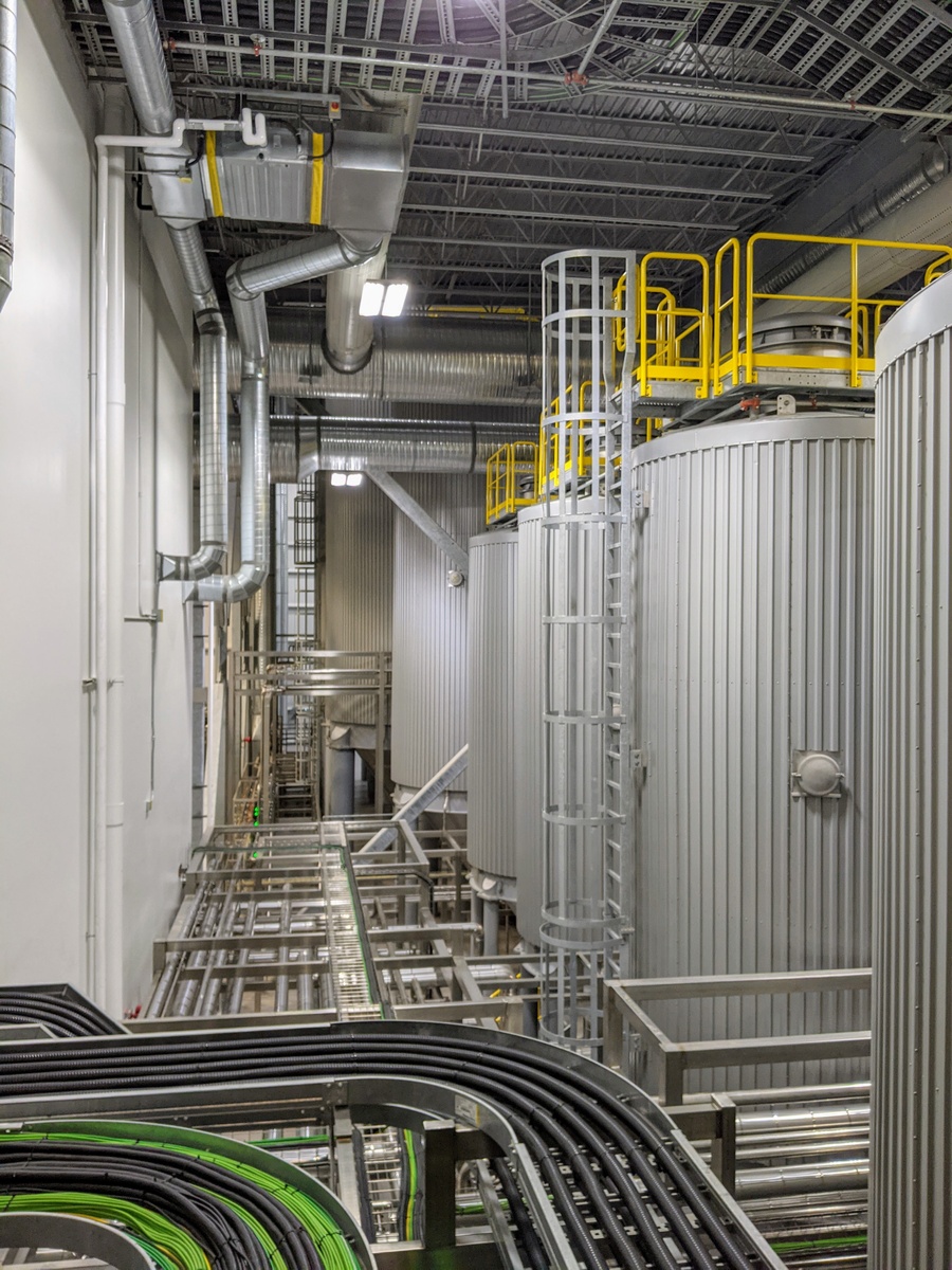 Windows in production areas: the design includes strategically placed windows in the production area. This is uncommon in the food and beverage production industry, but was done to give workers a connection to the time of day and the seasons, improving the occupant experience.