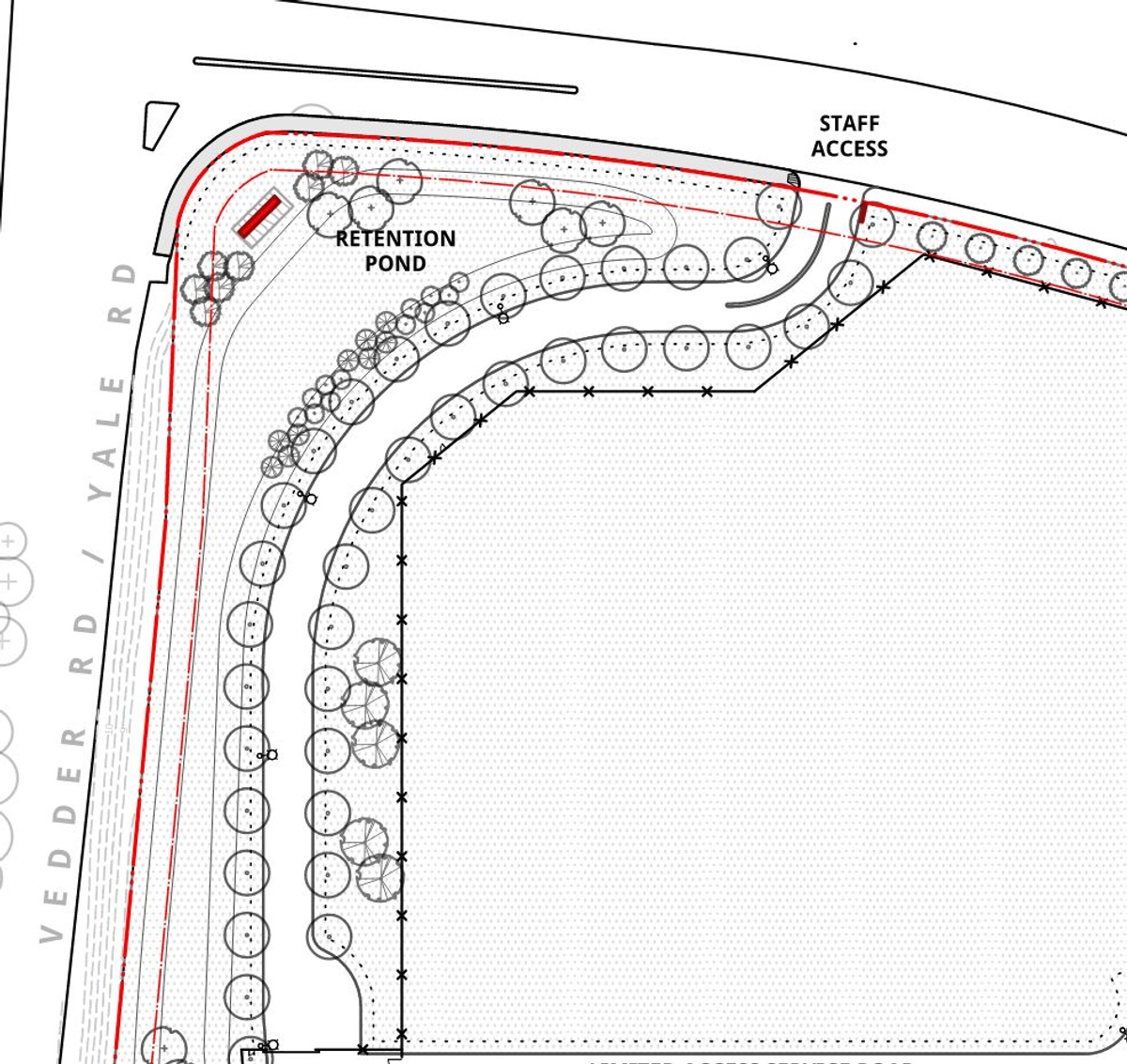The large retention pond collects runoff from impermeable surfaces, decreases peak flows and allows settling of suspended solids prior to discharge to storm.