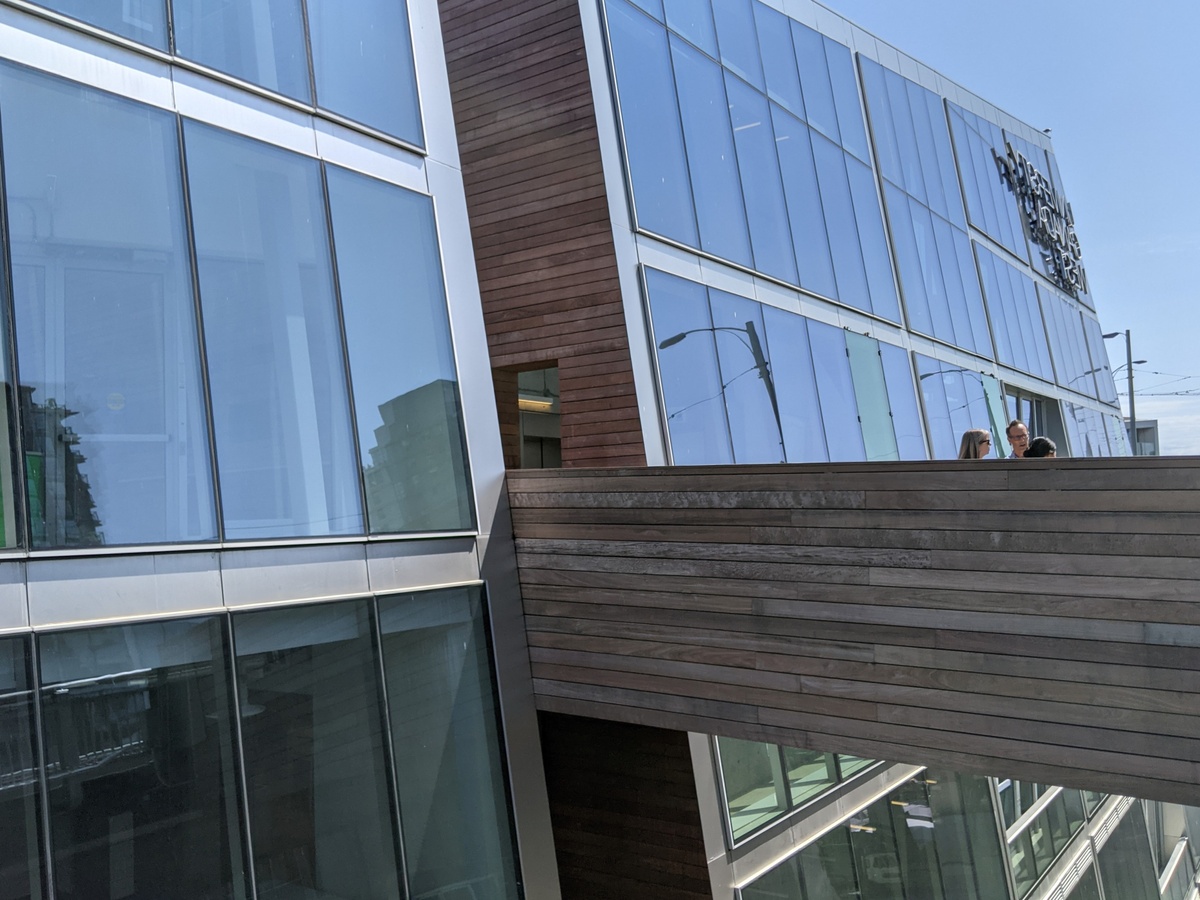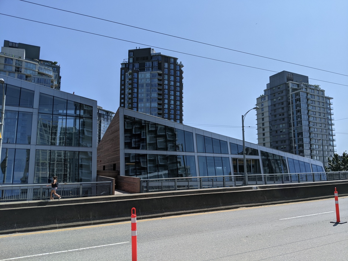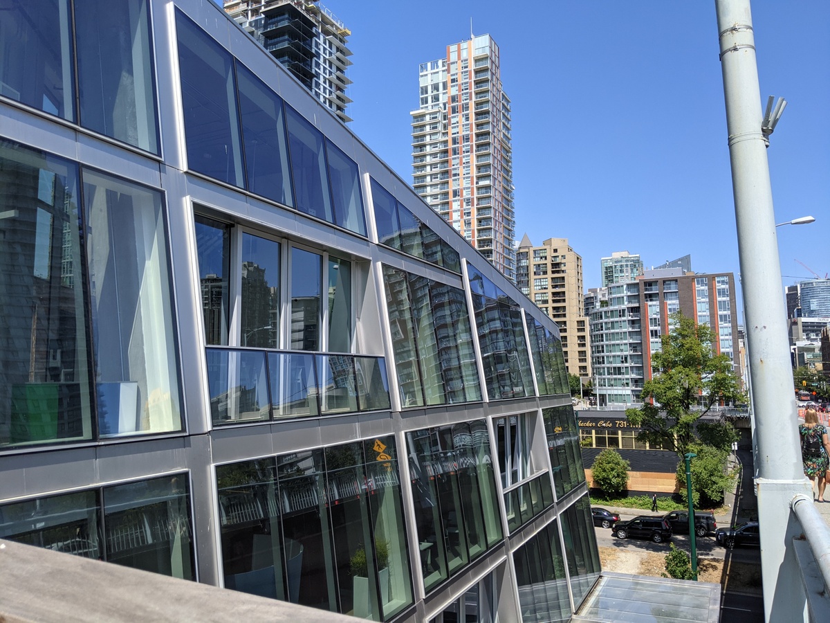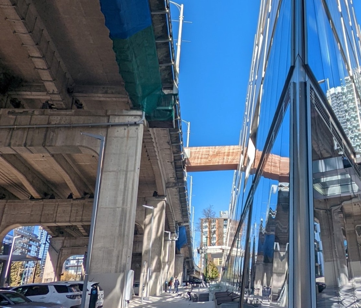 The building features a dedicated bridge from the building upper courtyard on Level 5 directly to the deck of the Granville street bridge. There is also a dedicated elevator to bring folks crossing from the bridge into the courtyard down to grade level, allowing flow-through foot and cycle traffic.