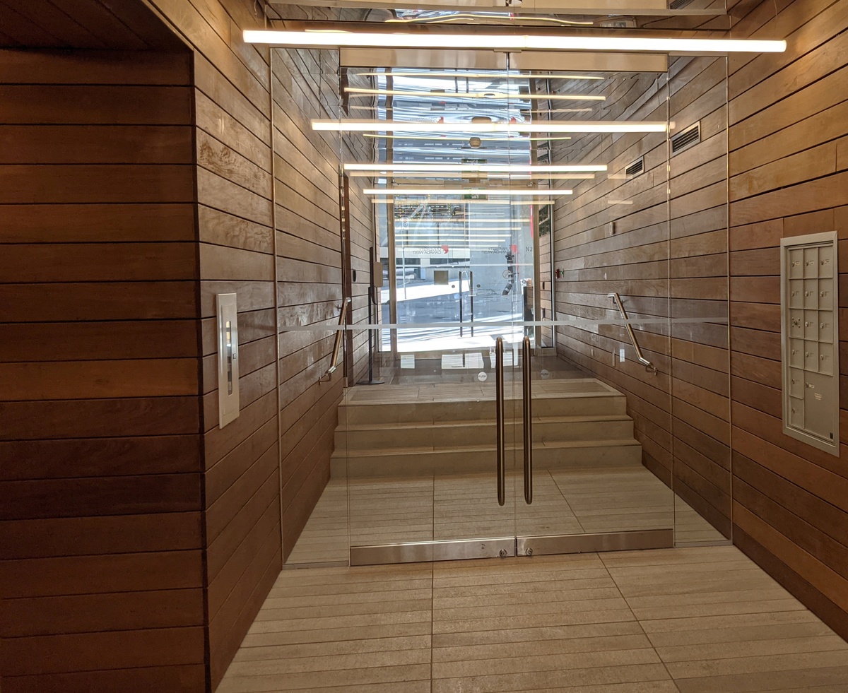 The building has a high performance envelope including heavy lift and slide balcony doors that also provide air tightness. This high level of air tightness keeps filtered conditioned interior air separate from outdoor air and saves energy, in addition to acoustic and thermal comfort benefits.