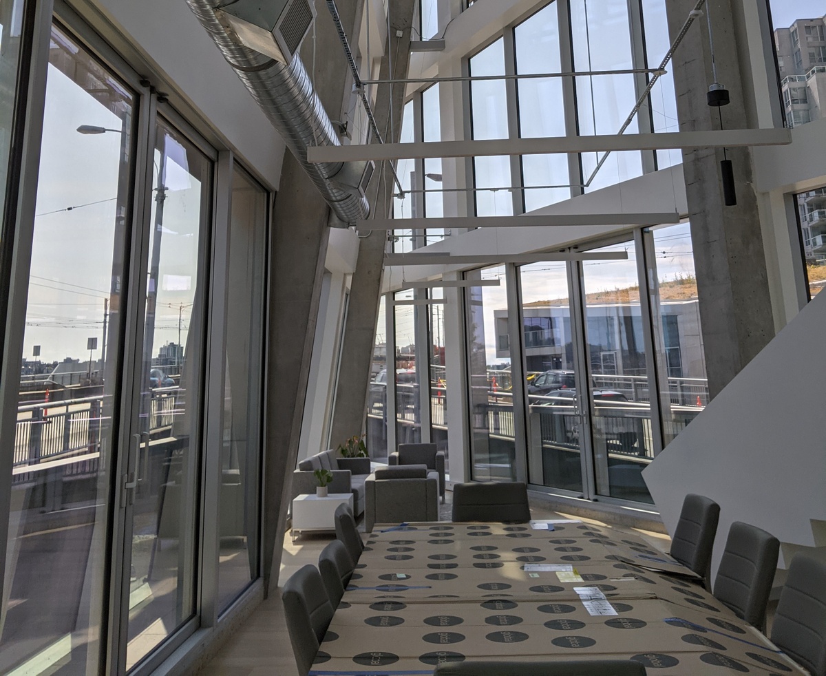 Generous amounts of glazing bring in plentiful daylight and connection to the outdoors. The triple-pane, air sealed windows allow excellent daylight access to occupants, views of the spectacular bridge and surrounding city, while keeping out unwanted noise and pollution from the bridge.