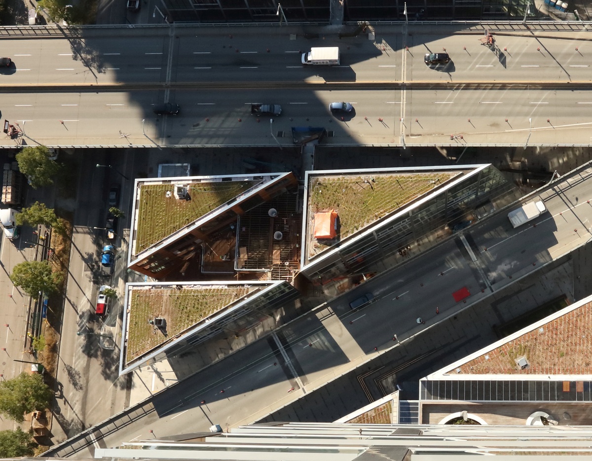 Soft landscaping was placed on the roof of this project instead of at the ground plane due to the shading of the adjacent bridge. The ground plane is shaded from direct sunlight for a significant portion of the day, thus reducing the capacity to grow and maintain healthy vegetation. Relocation of vegetation to the roof allows the project to take advantage of the rainwater-detaining properties of vegetated surfaces by moving those surfaces to a higher location where they have solar access.