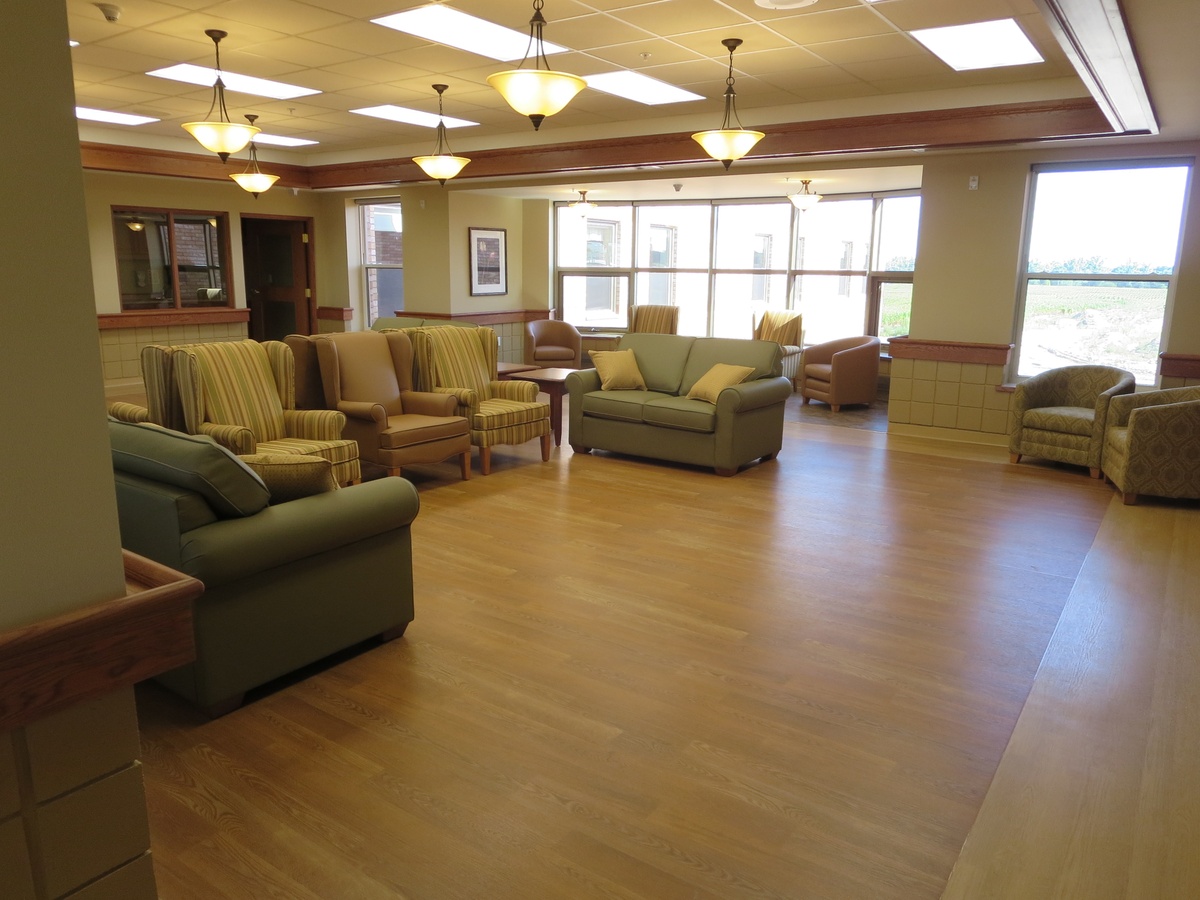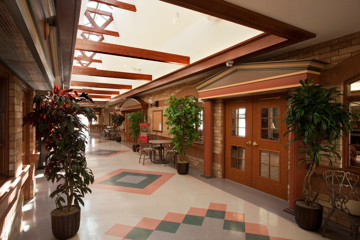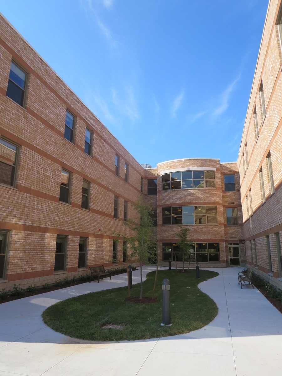 The Village at University Gates facility ensured there was open space equal to the building footprint available for occupants to enjoy, even after future development phases were taken into account. The site was graded to allow direct access to gardens on the main floor for residents as well as for the central rehabilitation program participants. Each home area on the upper floors is provided with a large balcony. In addition to the open outdoor space, a large covered porch area is provided on the main floor adjacent to the front entrance, with accessible walkways to outdoor spaces.