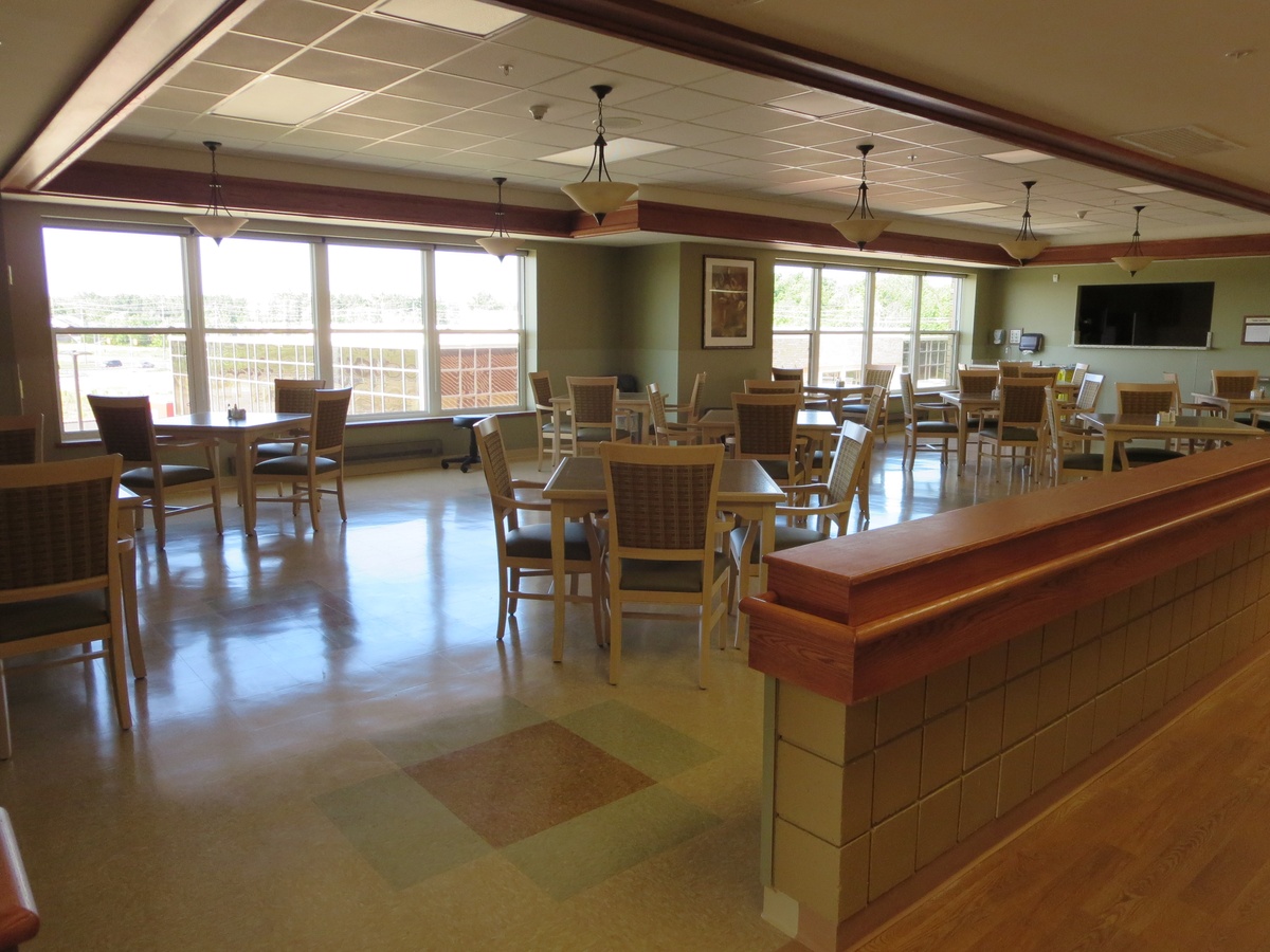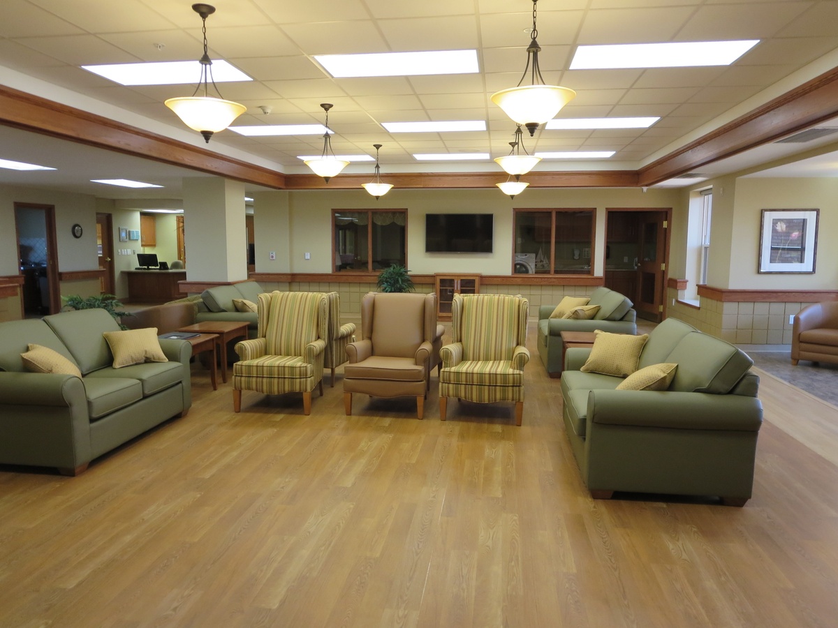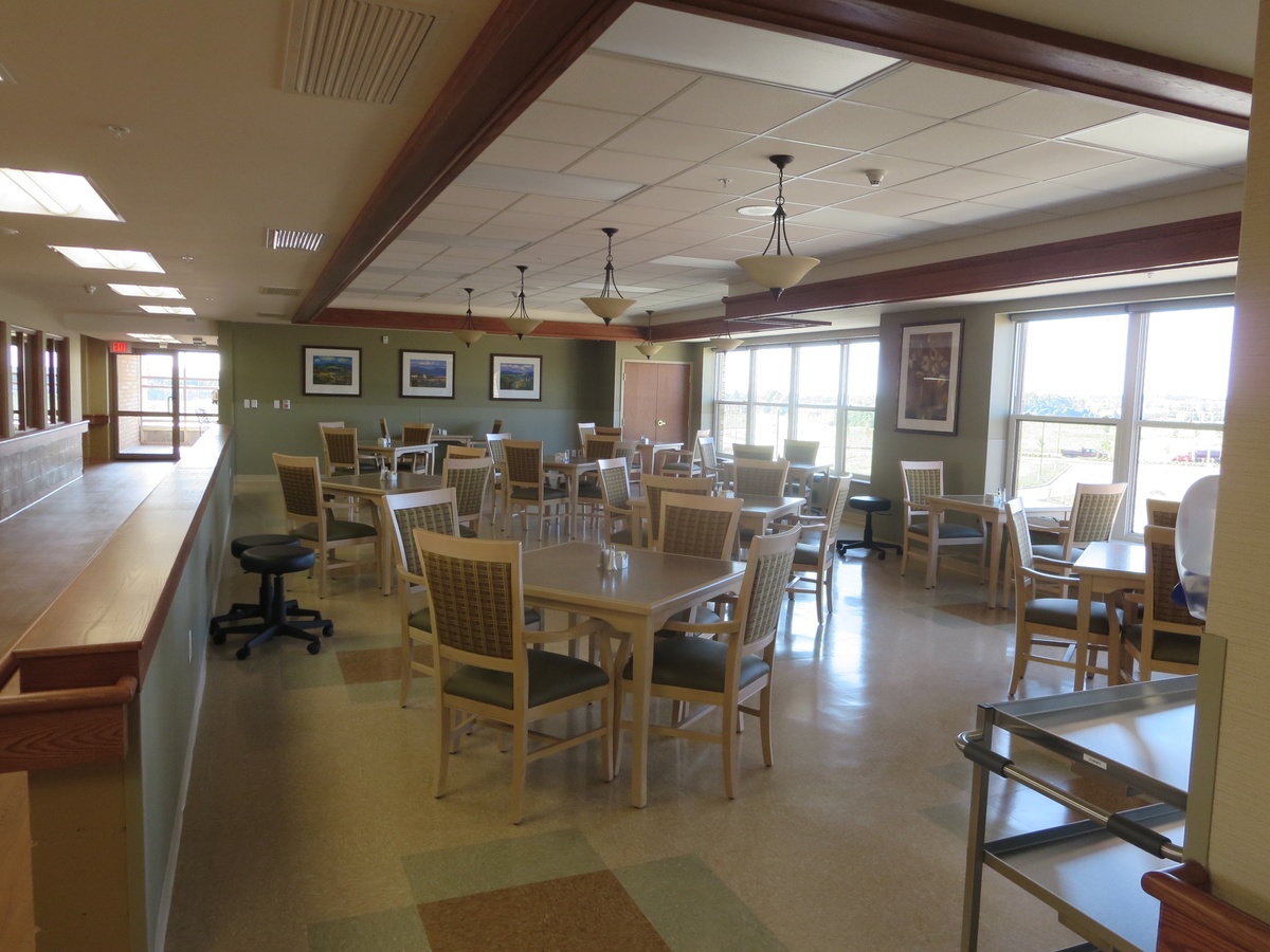 The Village at University Gates facility ensured there was open space equal to the building footprint available for occupants to enjoy, even after future development phases were taken into account. The site was graded to allow direct access to gardens on the main floor for residents as well as for the central rehabilitation program participants. Each home area on the upper floors is provided with a large balcony. In addition to the open outdoor space, a large covered porch area is provided on the main floor adjacent to the front entrance, with accessible walkways to outdoor spaces.