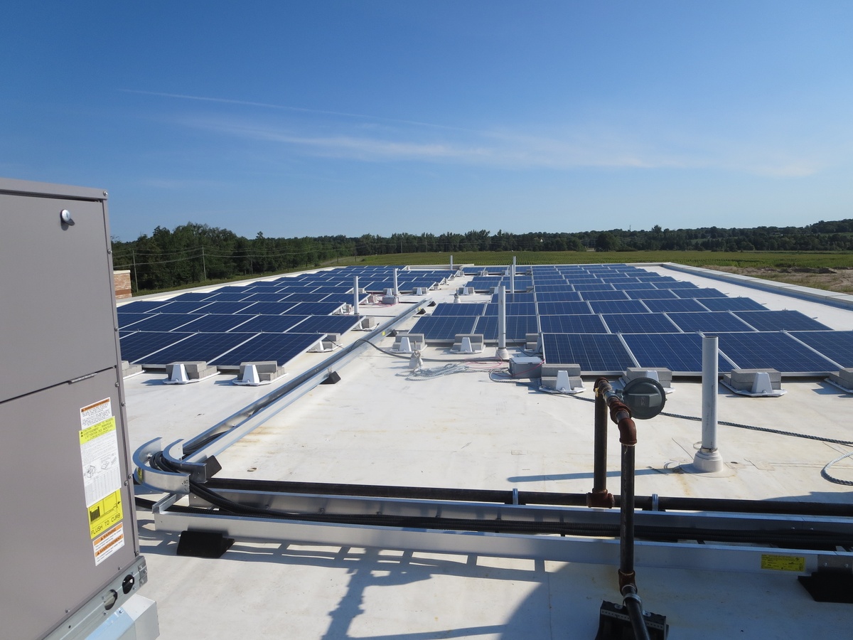 - 136 kW DC Photovoltaic (PV) solar panel system for on-site renewable energy equal to 6.5% of the project’s energy needs