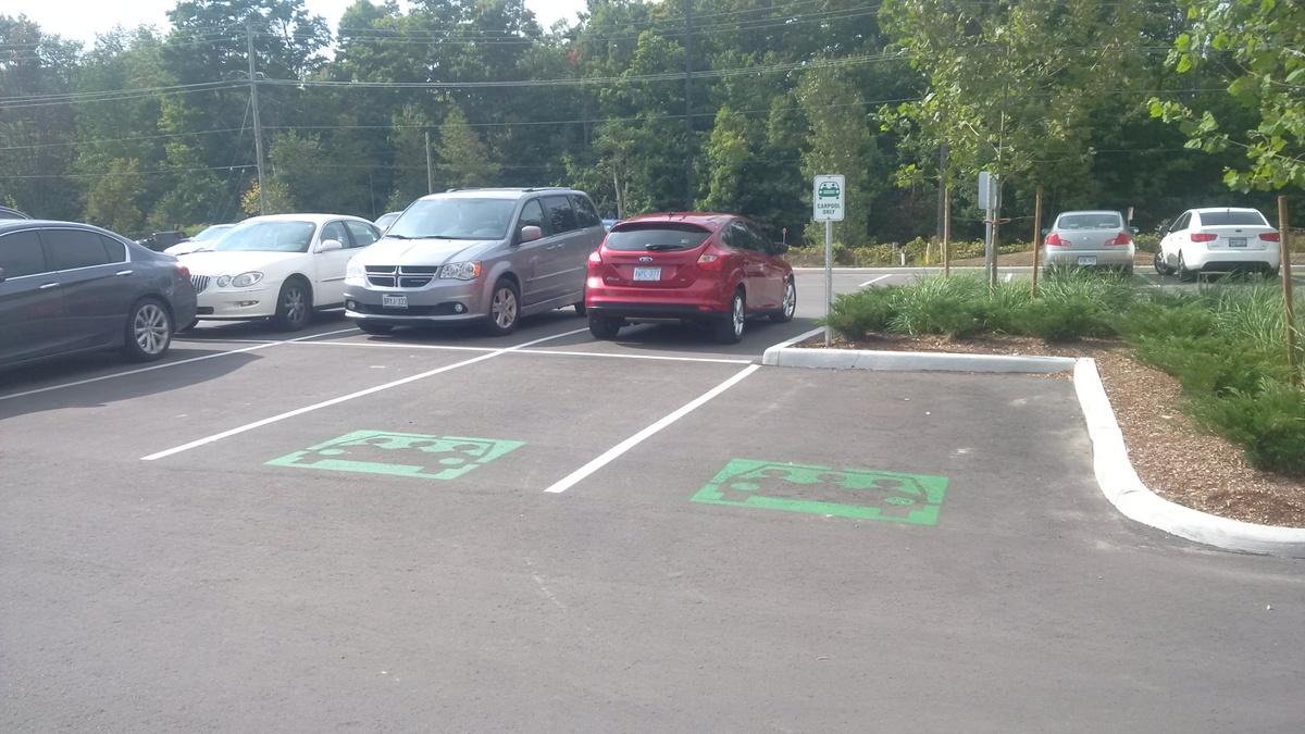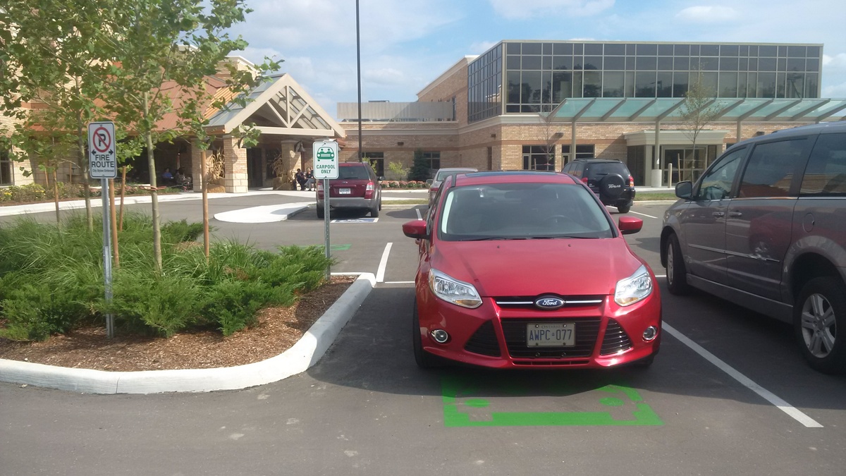 In the parking area, six electric vehicle charging stations have been installed to encourage the adoption of low-emitting vehicles. Installing electric vehicle charging stations is a prime means of future proofing a parking area. Designated carpool parking spaces have also been provided to encourage occupants to carpool to the facility.