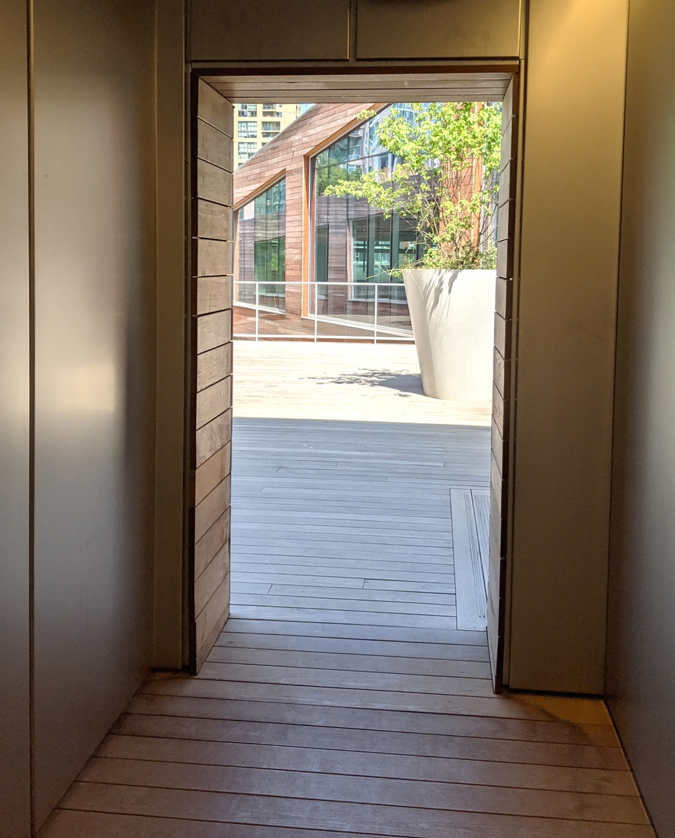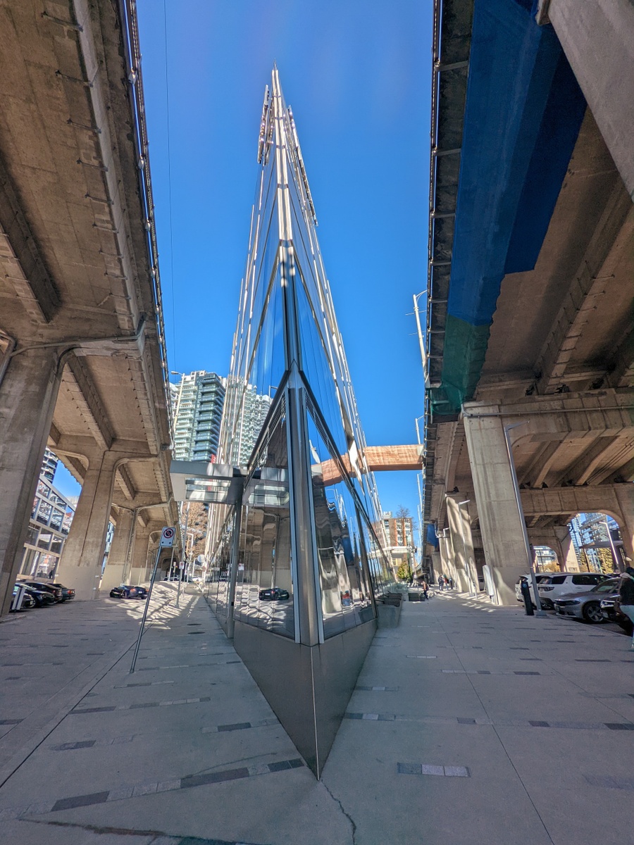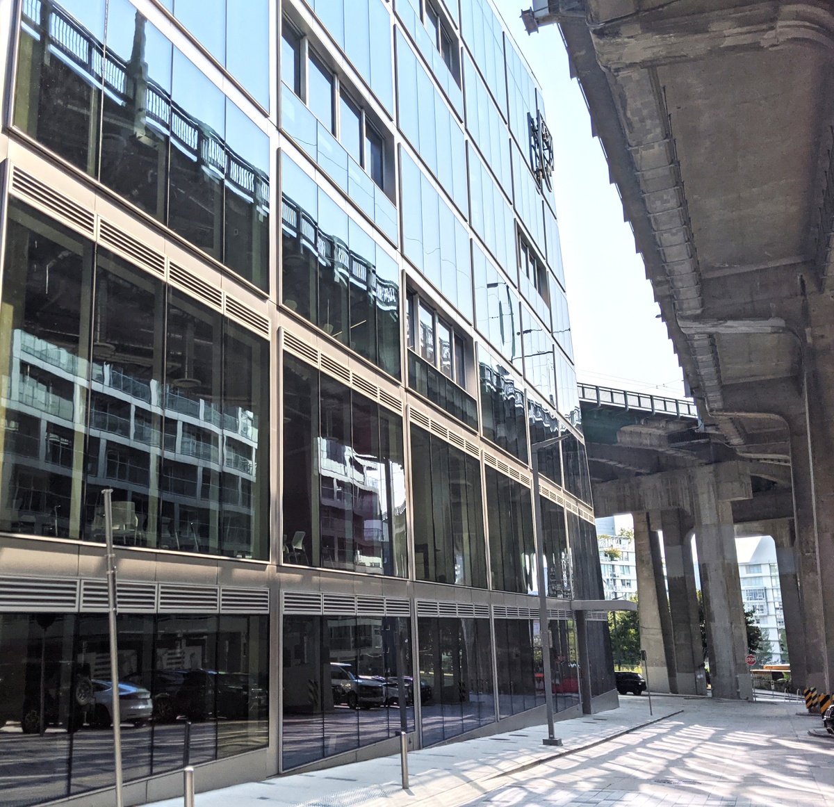 The building features a dedicated bridge from the building upper courtyard on Level 5 directly to the deck of the Granville street bridge. There is also a dedicated elevator to bring folks crossing from the bridge into the courtyard down to grade level, allowing flow-through foot and cycle traffic.
